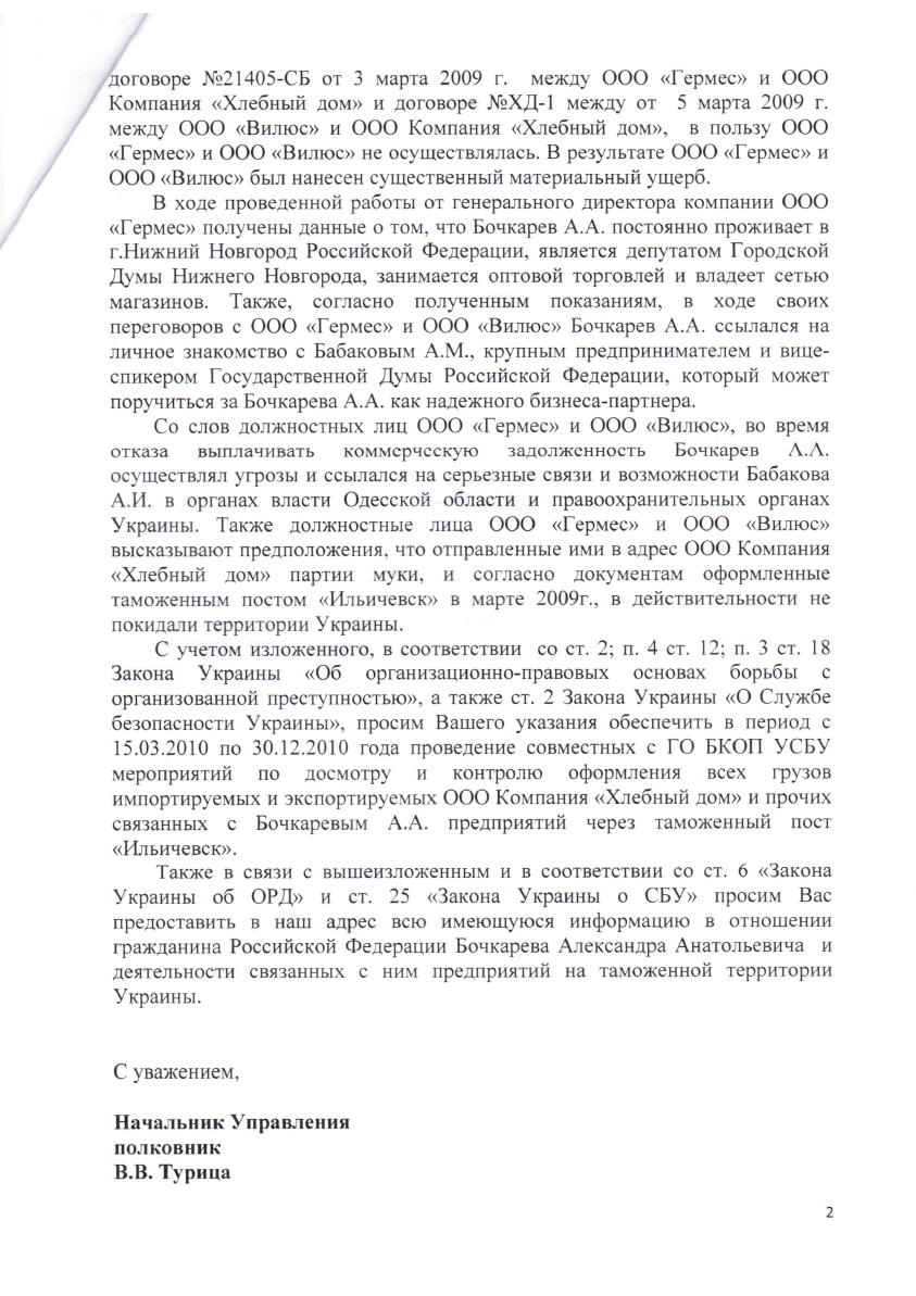 Однако оплата со стороны ООО «Хлебный Дом» за поставленную продукцию в сроки, указанные в договорах с компаниями «Гермес» и «Вилюс» так и не поступила. Когда же обратились за разъяснениями к А.А. Бочкареву, политику «Справедливой России» и успешному бизнесмену, то вместо ответов (не говоря уже об оплате) получили только угрозы одна другой страшнее. Что сам Бочкарев уже скупил все органы власти Одессы, а его покровитель вице-спикер Госдумы РФ Бабаков – все правоохранительные органы Украины. И что дальнейшие расспросы о судьбе пенсионеров голодающего Поволжья, полученной ими муке, а также о судьбе оплаты – приведут либо к тюрьме, либо к суме, либо к еще чему похлеще.