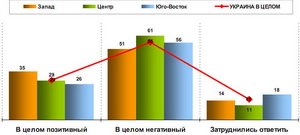 • За прошедшие 20 лет, по мнению украинцев, ситуация ухудшилась во всех основных сторонах жизни, за исключением возможности свободно выбирать место жительства, в том числе и за рубежом. Наибольшее ухудшение респондентами отмечено в таких сферах как гарантированность работы (87%), уверенность в завтрашнем дне (83%) и материальное благополучие (79%). В отношении возможности свободно выбитрать место жительства мнения разделились – треть респондентов (34%) считают, что в данном аспекте ситуация за 20 лет улучшилась и столько же придерживаются противоположной точки зрения.