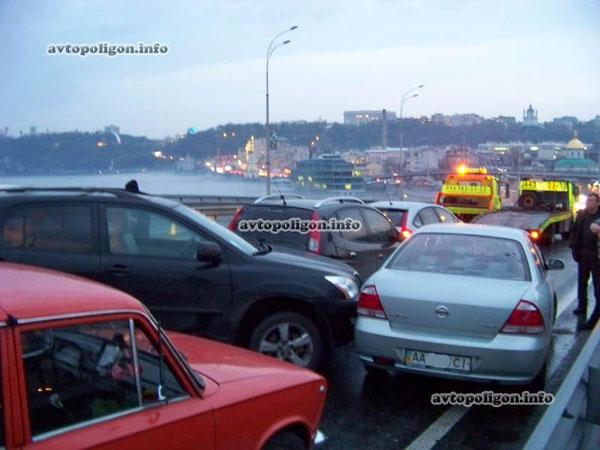 Все автомобили, попавшие в ДТП двигались в одном направлении от Набережно-Рыбальской (Оболони) в направлении Набережно-Крещатицкой (Подола),- передает Цензор.НЕТ со ссылкой на avtopoligon.info.