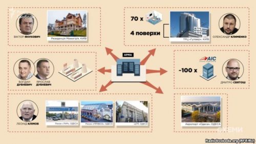 более 100 объектов недвижимости в 18 областных центрах Украины, принадлежащих группе компаний «АИС», одним из бенефициаров которой считается народный депутат Дмитрий Святаш;