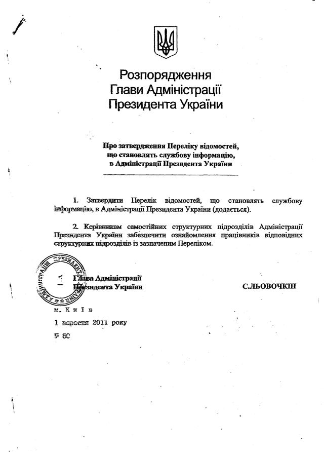 Цього розпорядження Льовочкіна годі шукати сьогодні на офіційному сайті гаранта. Нам вдалося його (розпорядження) отримати на інформаційний запит.