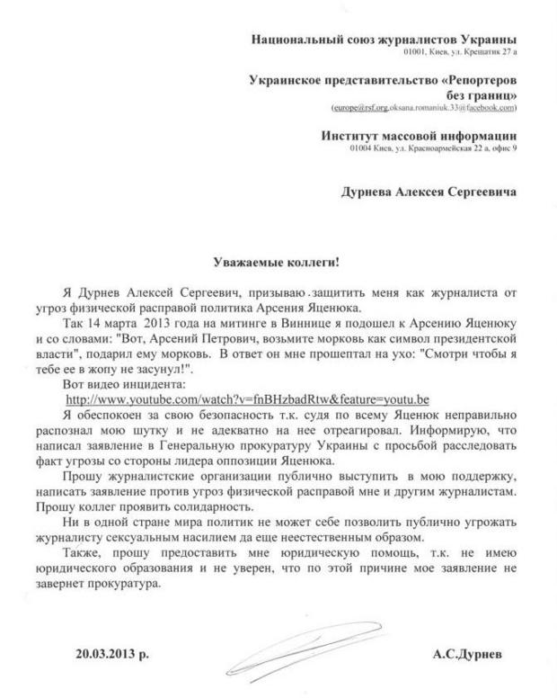 В связи с этим, шоумен Алексей Дурнев написал заявление в Национальный союз журналистов Украины со своими требованиями, а также попросил защитить его от домогательств Яценюка. "Я подал иск и в правоохранительные органы, и в Национальный союз журналистов Украины. Мне не нужны деньги, я требую от Яценюка, чтобы он извинился и съел морковь", - заявил он.