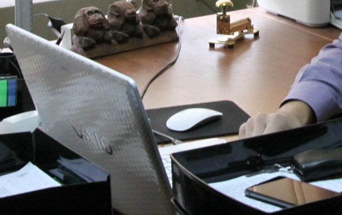 Рабочий стол старшего опера Донецка: беспроводная мышка Apple, испанской степлер, телевизор …