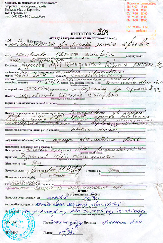 На тот момент, TOYOTA RAV-4 стояла на площадке уже десять дней, а потому Светлана уже была должна 2000 гривен (!). Представитель ГАИ заявил, что за разрешением нужно ехать в другое управление, которое находится в Киеве... но, после аргументов "Дорожного контроля", ГАИшник поставил на протоколе задержания транспортного средства печать и подпись о разрешении забрать автомобиль со штрафплощадки.