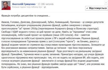 "Аваков, Головко, Денисова, Дзензерский, Зубко, Княжицкий, Лунченко - эти семь депутатов Батькивщины, вопреки вчерашнему решению фракции, синхронно с властью проголосовали "за" проект 2916д (преобразование Аграрного фонда в бизнес-структуру)", - пишет Гриценко.