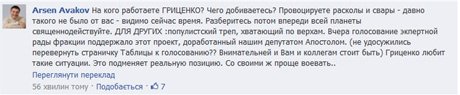 На обвинения Гриценко в Facebook пока ответил Арсен Аваков, который утверждает, что вчера голосование экспертного совета фракции поддержало законопроект 2916д , доработанный депутатом Апостолом. Он заявил, что это "война со своими".