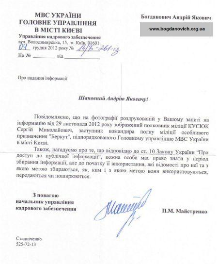 В СМИ появилась информация, что заместитель командира полка милиции особого назначения "Беркут" Кусюк Сергей отдал приказ разорвать оцепление во время штурма Администрации Президента.