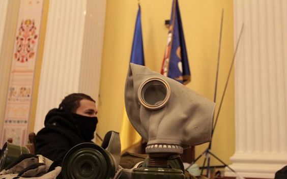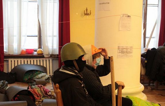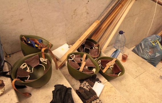 Митингующие уже начали готовиться к обороне здания КГГА. Мужская половина при помощи скотча привязала к ногам куски дерева, толстый слой утеплителя, а в руки взяли палки.