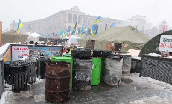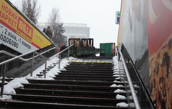 Помимо этого активисты построили оборону на станции метро "Площадь Независимости", вход в помещение проводится через охрану. Что касается торговли внутри, то она вся прекращена в связи с обострившимся положением. Также люди покрыли лестницы в подземку слоем пленки и залили ее водой. Это было сделано для того, чтобы образовался лед, который, по их мнению, помешает протиснуться «Беркуту».
