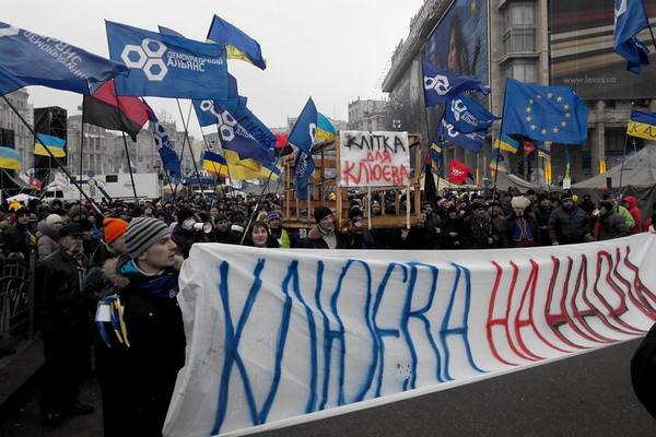 Отметим, в сегодняшнем марше приняли участие члены Демальянса. Именно они сделали деревянную клетку для Клюева и придумали лозунги типа: «Клюева в клетку», Клюева на нары, Захарченко с ним на пару".