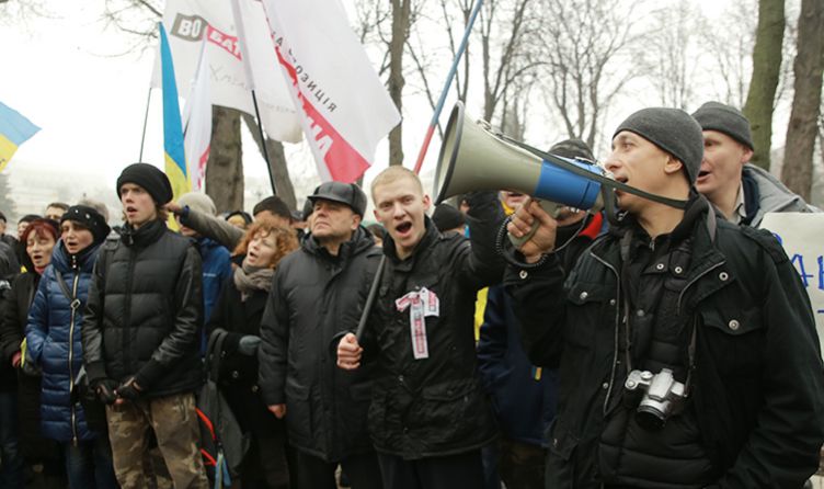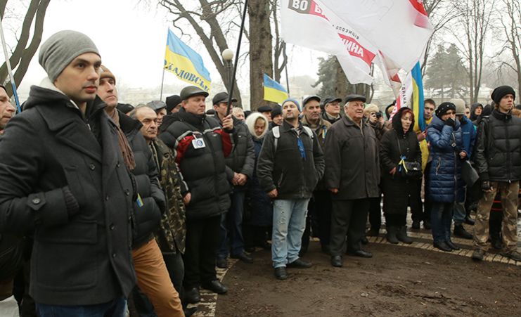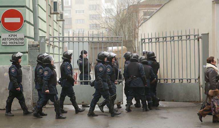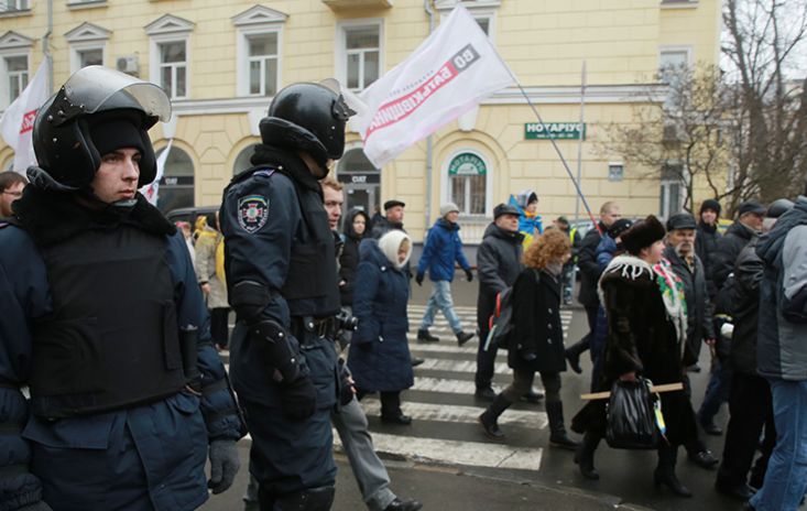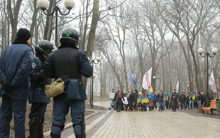 К активистам вышли представители Минздрава и пригласили на переговоры. На переговоры пошли организаторы пикета, другие остались у входа в помещение, им преградил дорогу "Беркут".