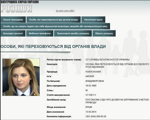 Служба безопасности Украины объявила в розыск генерального прокурора Крыма Наталью Поклонскую. Информация о ней обнародована также на сайте Министерства внутренних дел в разделе «Лица, которые скрываются от органов власти». Сообщается, что она подозревается в совершении преступления, предусмотренного частью 1 статьи109 УК Украины (действия, совершенные с целью насильственного изменения или свержения конституционного строя или захвата государственной власти).