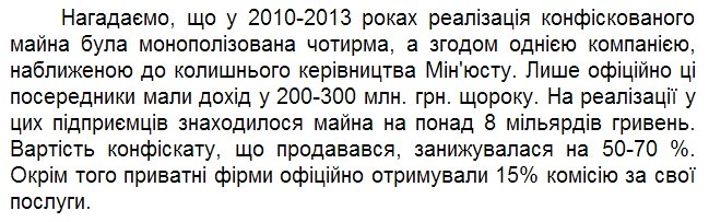 І поки державні регулятори організовують і переносять тендери та влаштовують публічні обговорення, компанія “Нива В. Ш.” продовжує спокійно працювати, отримуючи на багатомільярдному ринку свої 15%, а афільована з нею “Альфа хімтрейд” уже освоює електронні торги, де почала заробляти свої 3%.Цей меседж лунає мало не на кожній прес-конференції представників Мін’юсту і майже все в ньому правильно. Крім однієї деталі — реалізація конфіскованого майна не “була”, а й досі залишається монополізованою.