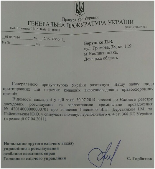 Дальше происходили чудеса. Уже 1 августа Борулько получает ответ, в котором Генеральная прокуратура сообщает Банкиру радостную весть: факты проверены, начато уголовное производство по части 4 статьи 368 УК Украины. Феноменальная скорость открытия производства, вам не кажется? И это в Генеральной прокуратуре, заваленной сейчас тысячами дел о сепаратизме и посягательстве на территориальную целостность страны.