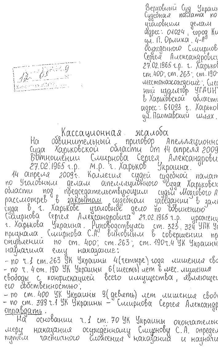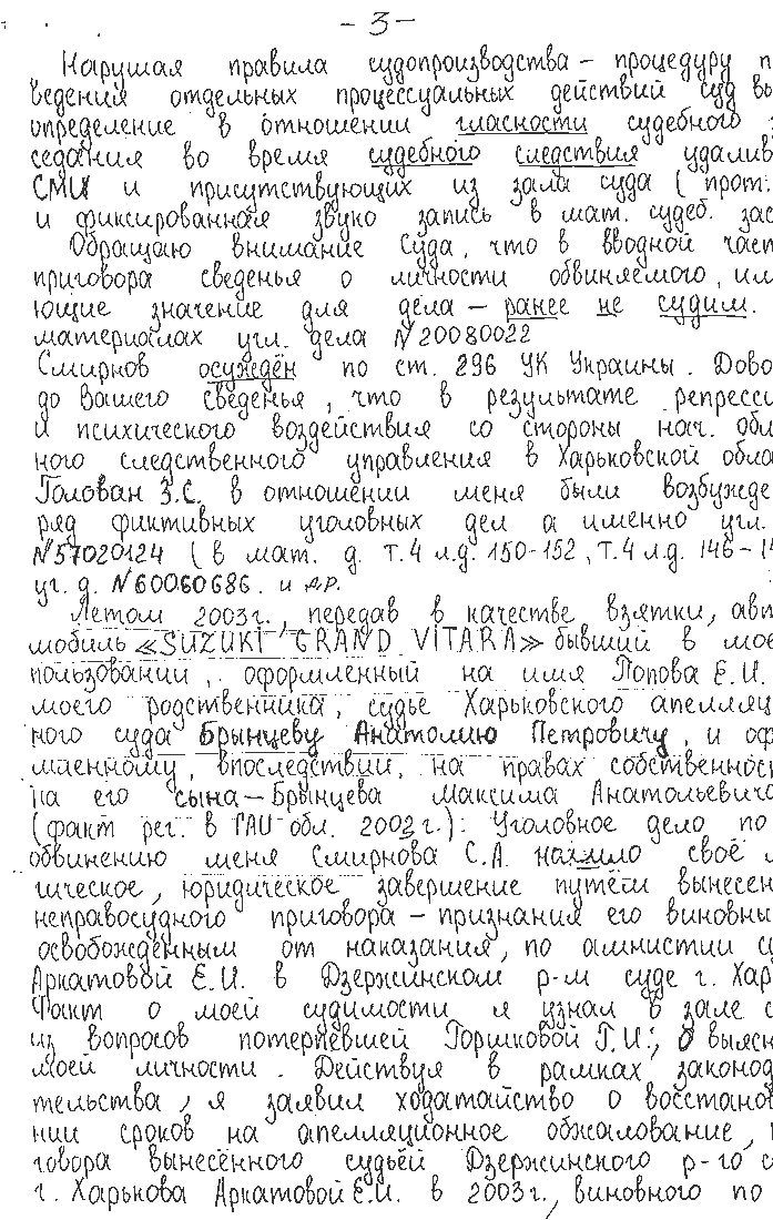 Летом 2003 г., передав в качестве взятки, автомобиль «SUZUKI GRAND VITARA» бывший в моем пользовании, оформленный на имя Попова Е. И. – моего родственника, судье Харьковского апелляционного суда Брынцеву Анатолию Петровичу, и оформленному, впоследствии, на правах собственности на его сына – Брынцева Максима Анатольевича (факт рег. в ГАИ обл. 2003 г.). Уголовное дело по обвинению меня Смирнова С. А. нашло свое логическое, юридическое завершение путем вынесения неправосудного приговора – признания его виновным, освобожденным от наказания по амнистии судьей Аркатовой Е. И. в Дзержинском р-м суде г. Харькова.