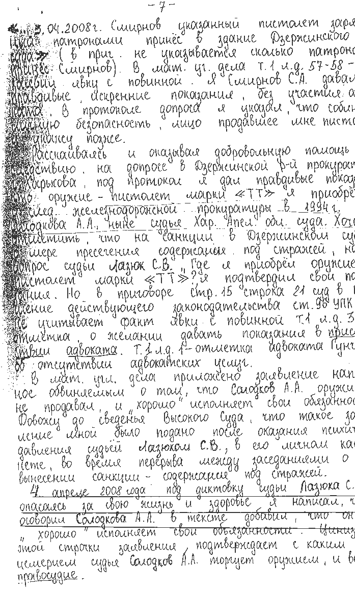 4 апреля 2008 года под диктовку судьи Лазюка С. В., опасаясь за свою жизнь и здоровье я написал, что оговорил Солодкова А. А. в тексте добавил, что он «хорошо» исполняет свои обязанности. Цинизм этой строчки заявления подтверждает с каким лицемерием судья Солодков А. А. торгует оружием, и вершит правосудие» - писал Смирнов в кассационной жалобе на обвинительный приговор. Но и это не помогло – приговором суда он был осужден за мошенничество и попытку убийства на десять с половиной лет.