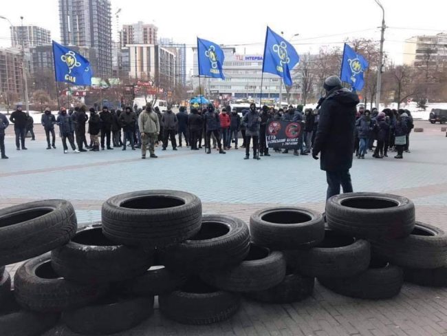 Активисты национальных движений устроили пикет у столичного торгового центра "Ocean Plaza", зажгли дымовые шашки.