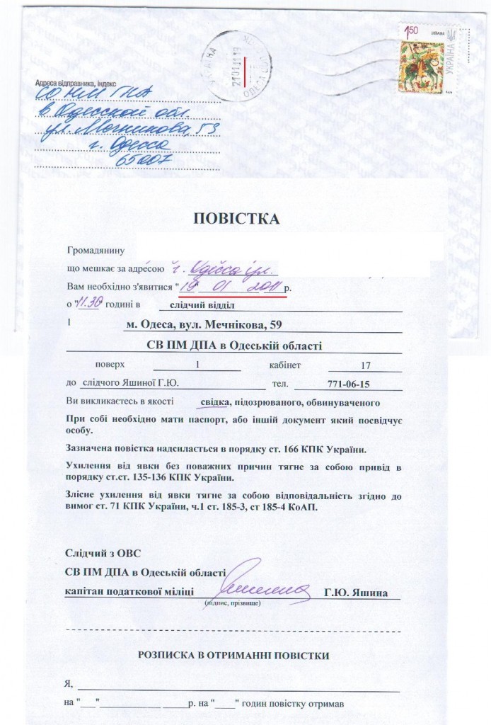Одесситка, следователь по особоважным делам следственного отдела налоговой милиции ГНА в Одесской области Яшина Г.Ю. не подбрасывает кошельков своим подопечным — неплательщикам налогов (утверждать этого с полной уверенностью мы, конечно же, не можем, но, по крайней мере факты таковые нам не известны). Следователь Яшина Г.Ю. действует более изощренно. Имея намерением “подвести под статью” конкретное лицо, она выписывает ему повестку, в которой указано, что необходимо явиться в качестве свидетеля в следственный отдел налоговой милиции Одесской области к этой самой Яшиной Г.Ю. такого-то числа и высылает эту повестку по месту жительства этого самого лица. Вот только получает эту повестку получатель на несколько дней позже указанного в повестке дня.