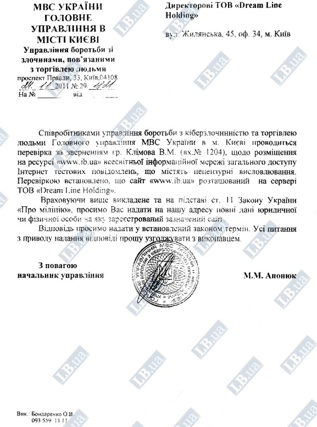 Сегодня ООО "Dream Line Holding", на сервере которого размещено интернет-издание LB.ua, уведомило редакцию LB.ua о том, что Главное управление по киберпреступности и торговле людьми МВД Украины в городе Киеве просит предоставить "полные данные про физическое или юридическое лицо", на которого зарегистрирован сайт LB.ua.