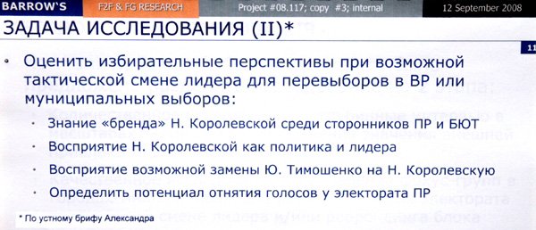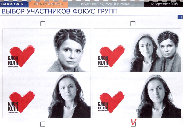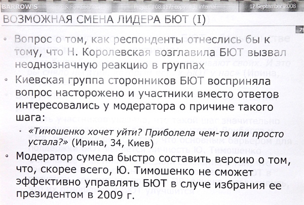Документ представляет собой более ста страниц социологических выкладок под общим названием "Анализ влияния на электорат потенциальной смены лидера БЮТ", проведенных компанией "Barrow’s Consumer Insights".