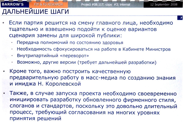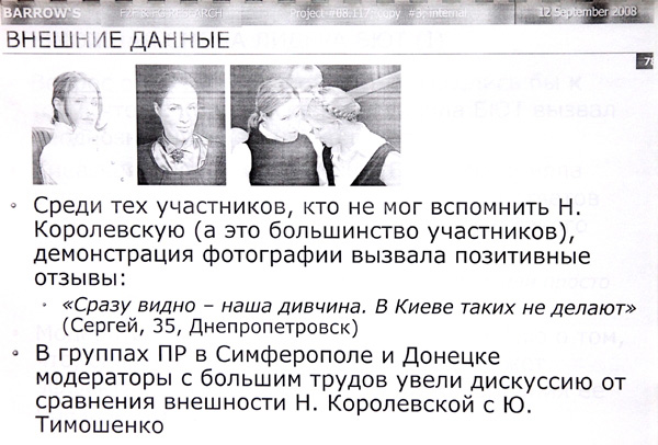 В своих выводах авторы документ не поскупились на комплименты Наталье Королевской. Несмотря на низкую узнаваемость и неоднозначную реакцию на смену лидера в БЮТ, депутату пророчили весьма успешный переход в категорию женщина-политический лидер.