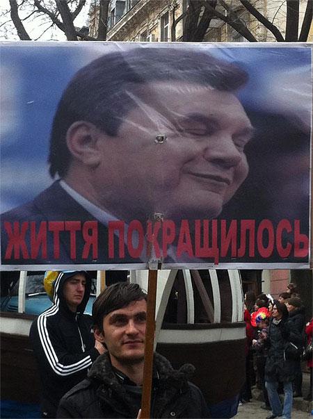 Парень, который шел в конце колонны, нёс плакат с изображением Януковича* и надписью "Життя покращилося". Возле виска на портрете была дырка,- передает Цензор.НЕТ со ссылкой на PR-портал.