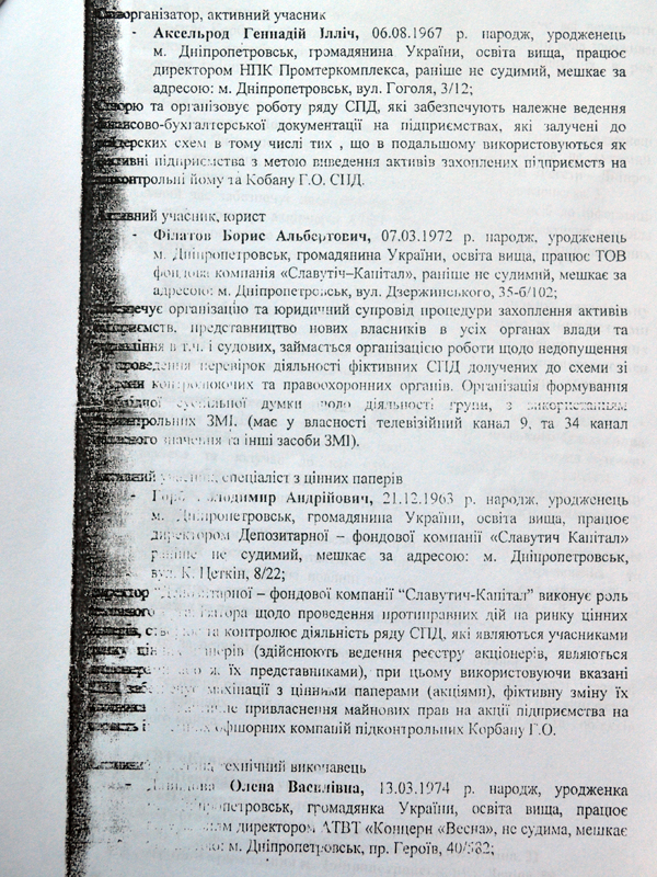 Вот, например, часть материалов, которые ходили в декабре 2011 в Генпрокуратуре по группировкам в Днепропетровской области. Первым пишут – Геннадий Корбан. «Розробляє схеми захоплення підприємств, має стійкі зв’язки з членами фінансово-промилових груп (ну, это правда, не отрицаю), що діють на території Дніпропетровської області і України в цілому, підтримує корупційні зв’язки в органах влади та правоохоронних, контролюючих та судових органах, створює діяльність іноземних офшорних компаній, які в подальшому причетні до привласнення активів захоплених підприємств».
