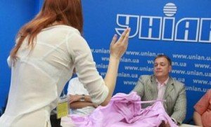 Сегодня, активистка КУПР бросила в народного депутата от Партии регионов Вадима Колесниченко смирительную рубашку. Это произошло во время пресс-конференции в Киеве, в ходе которой обсуждался вопрос относительно ущемления прав русскоговорящих детей.