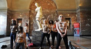 Активистки женского движения FEMEN устроили акцию в парижском Лувре. Обнаженные девушки выстроились перед статуей Венеры Милосской, протестуя против секс-туризма, религиозных учреждений, международных брачных агентств и прочих социальных, национальных или международных проявлений сексизма.