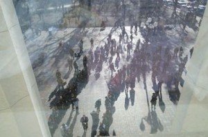 У нескольких человек в руках черно-красные флаги, а также флаг Автодозора. Люди держат плакаты "Свободу активистам Автомайдана". Сбоку возле коридора стоит барабан, в который бьют два активиста.