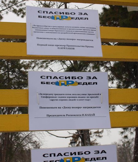 Республиканскую доску почета в сквере Тренева в Симферополе сегодня украсили табличками с фамилиями крымских чиновников, которые сделали жизнь жителей полуострова «лучше». Антирейтинговое мероприятие провели активисты общественного движения «Крымские партизаны» и присоединившиеся к ним жители Симферополя.