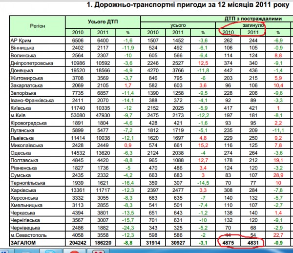 Про це свідать документи. За даними звіту ДАІ, опублікованого в січні 2012 року, у 2011 році внаслідок ДТП в Україні загинули 4831 особа, що, як стверджується, на 0,9% менше, ніж в попередньому році, коли загинуло ніби-то 4875 осіб.