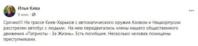 «Срочно!!! На трассе Киев – Харьков из автоматического оружия «Азовом» и «Нацкорпусом» расстрелян автобус с людьми. На нем передвигались члены нашего общественного движения «Патриоты – за жизнь». Есть погибшие. Несколько человек похищены преступниками», – сразу же написал нардеп.