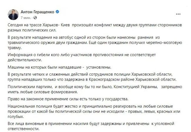 Заместитель министра внутренних дел Антон Геращенко сообщил в Facebook, что на трассе Киев – Харьков произошёл конфликт между двумя группами сторонников разных политических сил.