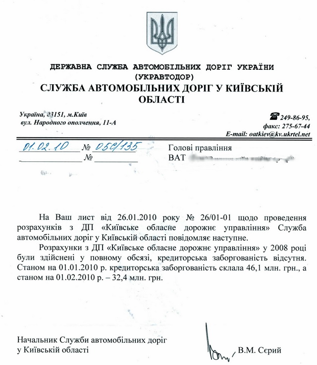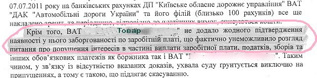 Заметим: существующих задолженностей перед ООО «Товар» и прочими поставщиками и подрядчиками по сути быть не может, ибо средства, которые «Укравтодор» ему перечисляет, имеют сугубо целевое назначение. И коль «Облавтодор» покупал у ООО «Товар» продукцию, делал оно это исключительно в рамках, предписанных условиями договора с «Укравтодором» и в объемах, определенных бюджетным финансированием. Более того, редакция располагает документом, свидетельствующим, что в 2008 году (именно за поставки этого года оно не рассчиталось с ООО «Товар») «Облавтодор» получил все причитающиеся суммы за выполненные работы в полном объёме. Кредиторской задолженности у «Облавтодора» не было.