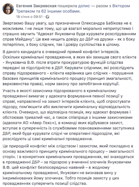 О «естественном конфликте между следствием и защитой» и о том, почему есть основания говорить о наличии у господина Бабикова конфликта интересов с точки зрения антикоррупционного законодательства, достаточно полно объяснила в своем посте в Фейсбуке Евгения Закревскаяя: