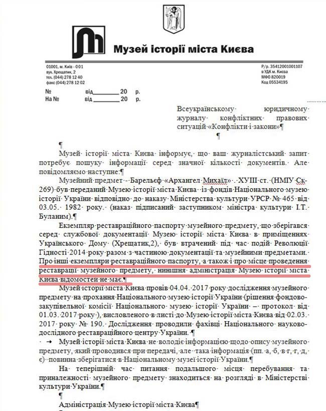 Таким чином, для отримання детальної інформації щодо стану музейного предмету – барельєфу «Архангел Михаїл» редакції «Конфліктів і законів» необхідно звернутись до Національного музею історії України, у якому зазначений предмет перебуває на обліку в основному фонді».