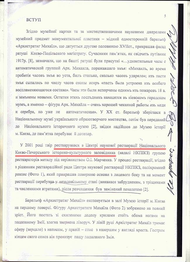 Тож, коли з’ясувалось, що барельєф захисника Києва «Архангела Михаїла», що ще за радянських часів у 1982 році було передано Національним музеєм історії України (на той час - Державний історичний музей УРСР) до Музею історії Києва, наразі суттєво відрізняється від фото, як його було зафіксовано до того, як його передали, постало абсолютно логічне питання: з якого дива так сталось? Представники Музею історії Києва зміну зовнішнього вигляду пояснювали реставрацією. Проте в усьому світі реставрація - це сукупність рятувальних, відновлювальних і консервативних засобів відносно творів мистецтва (від ювелірства - до архітектури). А той об’єкт, що виставлено в Музеї історії Києва, суттєво відрізняється від об’єкту, який йому передавали.