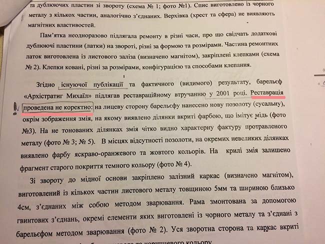 Але найцікавіше в тому, що, вже згідно з висновком проведення експертизи барельєфу Архистратиг Михаїл, реставрація була проведена некоректно, хоча експертиза і підтвердила, що основа барельєфа автентична, проте поверхня пам'ятки повністю вкрита шарами поновлення.