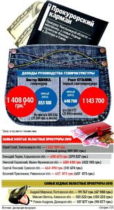 Областные прокуроры, по требованию генпрокурора Виктора Пшонки, все, как один, опубликовали декларации о доходах за 2010 год. Согласно отчетам, больше всех в 2010-м заработал Василий Присяжнюк, надзирающий за законностью в Ровенской области — его годовой доход 657 тыс. грн. (в декларации он указал лишь зарплату и материальную помощь — в сумме это чуть больше 185 тыс., откуда появились еще почти полмиллиона — загадка).