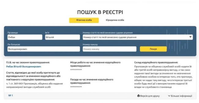 В материале подчеркивается, что на момент принятия решений о передаче земель Ходосовским сельским председателем был Рыбак Виталий Владимирович. «Человек с аналогичными ФИО официально внесен в Реестр коррупционеров по ч. 1 ст. 369 УКУ – предложение, обещание или предоставление неправомерной выгоды должностному лицу», – отмечают расследователи.