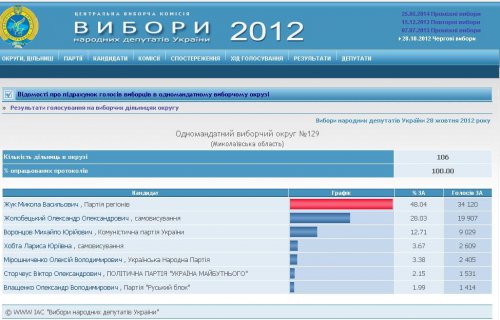 Интересна и сама избирательная схема, позволившая «скромному самовысуванцу» занять 2-е место на выборах-2012 и поэтому уверенно лидировать на нынешних выборах. Почему если против «регионов» то обязательно за Жолобецкого, а не за баллотировавшихся по тому же 129 округу кандидата от «ОО» (не путать с надписью на туалете, - «Объединенная оппозиция» - бренд под которым на выборах 2012 года шли объединившиеся «Батькивщина» Тимошенко и «Фронт змин» Яценюка) В.Пидберезняка, представлявшего «УДАР» С.Ольховского или кого-то из представителей других политических сил?