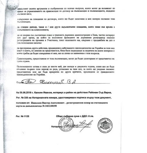 Свидетельство болгарского нотариуса, имя которого стоит на поддельной доверенности, что к нему никто от имени Виктора Николаева не обращался