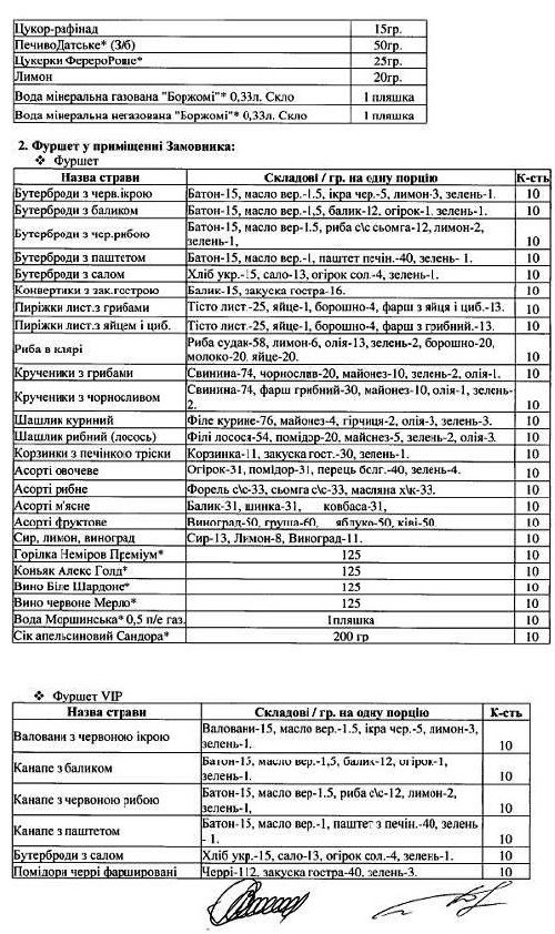 Три раза в месяц VIP-фуршеты. К предыдущему меню добавляют канапе, шашлык из креветок, мидии запеченные с сыром, кольца кальмаров, рыбные палочки, из лосося, корзинки из печени трески, деруны с икрой, блины с грибами, ананасы. Алкоголь меняется: водка уже «Гетьман», коньяк уже «Hennessy VSOP».