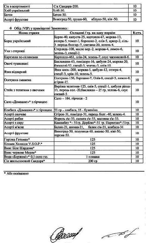 Пять раз в месяц руководство «Нафтогаза» обедает. На выбор борщ или грибной суп, буженина, котлеты из индейки или отварной лосось. На гарнир картофель фри или рис. Из салатов либо нарезка из свежих овощей, либо «Козырный» (пекинская капуста, помидоры, балык, сыр, майонез). До этого фрукты и хлеб. К хлебу – ничего.