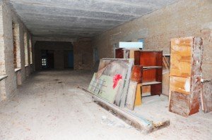 Учебный корпус находим в еще более плачевном состоянии. Внутри здание полностью разобрано – голые стены, навалы парт и стульев, строительный мусор. Зато окна – высокие, белоснежные, пластиковые. Как они держатся в старых, расходящихся трещинами проемах, понятно не всегда.