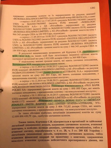 Позиция следствия заключается в том, что покупка эта была оплачена деньгами, добытыми преступным путем, и именно эти деньги, «одержанные злочинным шляхом в особливо великих размерах», были пущены Николаем Злочевским на выплаты членам совета директоров «Буризмы». В частности, 1 млн евро был переведен на счет экс-президента Польши Александра Квасневского, а 3 404 712,82 доллара — на счет компании Rosemont Seneca, представлявшей интересы Хантера Байдена.