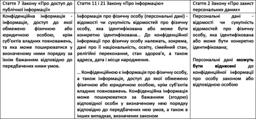 В украинском законодательстве сразу несколько законов регулирующих вопросы предоставления информации о физических и юридических лиц. Это и Закон «Об информации», регулирующего отношения по получению и распространению информации, и Закон «О защите персональных данных», который определяет защиту и обработку персональных данных, и Закон «О доступе к публичной информации», который дает право на получение информации, находящейся во владении распорядителей.