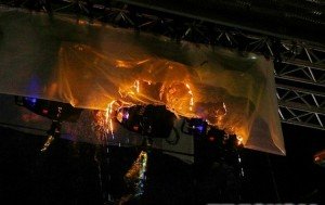Угоду щодо переоцінки даху було укладено за тиждень до урочистого відкриття НСК «Олімпійський». На церемонії 7 жовтня одна з петард святкового салюту підпалила плівку, яка накривала освітлювальні прилади. Великої пожежі вдалось запобігти дякуючи робітнику стадіону, який загасив полум’я вогнегасником. На людей на трибунах той час вже лився розплавлений пластик.