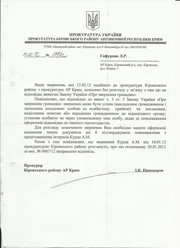 "После аварии сразу же на ноги была поднята милиция РО пгт Кировское во главе с ОВЧАРОВЫМ ПАВЛОМ. После установления факта гибели моего сына Эдема 18лет было открыто уголовное дело, но расследование по данной аварии остановлено. Этой же ночью произошла подмена убийцы Гук Владимира на мужчину преклонного возраста Деревянченко Алексея Михайловича 57 лет, который оказался тестем ГУКА ВЛАДИМИРА. Фальсификация факта преступления проводилась при активном участии начальника милиции Овчарова Павла Анатольевича, начальником криминальной милиции пгт Кировское Сулемы Николая Ивановича и прокурора района Пивоварова Игоря К." - Лилия Гафурова.